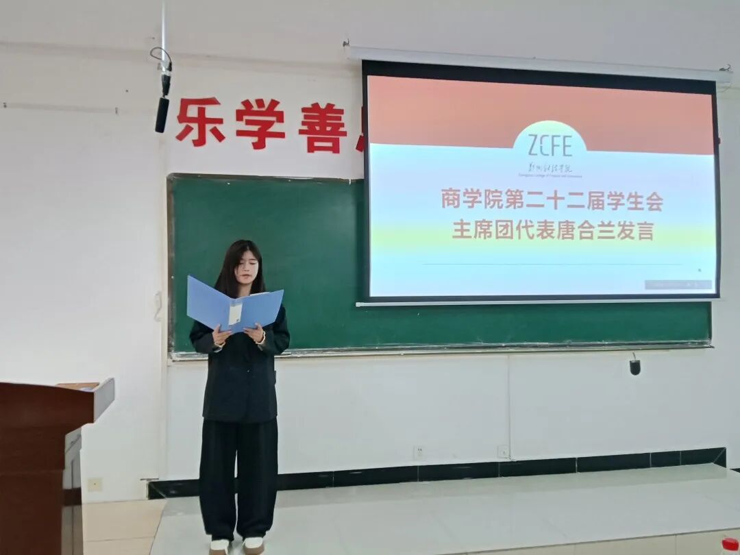 唐合兰作为第二十二届学生会主席团代表发言,她表达了对领导老师信任的感激,也展现了新一届学生会成员的信心与决心,表示将带领团队以全新的姿态投入工作,创新活动形式,提升服务质量,为同学们打造更具活力与温度的校园生活。