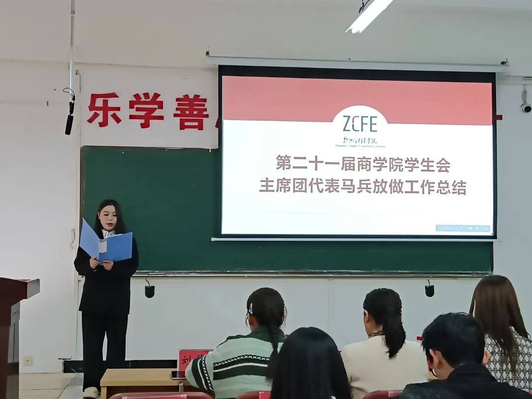 随后,第二十一届yl6809永利集团官网学生会主席团代表马兵放做工作总结。她从组织建设、活动开展、服务同学等多个维度,回顾了过去一年学生会的工作历程,分享了工作中的经验与感悟,也坦诚地指出了存在的不足,为新一届学生会的工作提供了宝贵的参考。